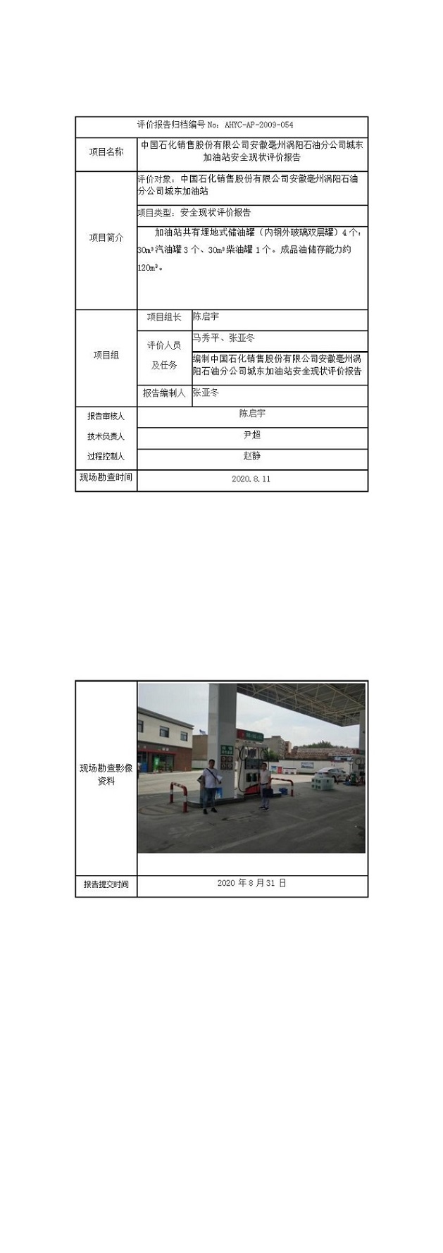 中國石化銷售股份有限公司安徽亳州渦陽石油分公司城東加油站安全現狀評價報告