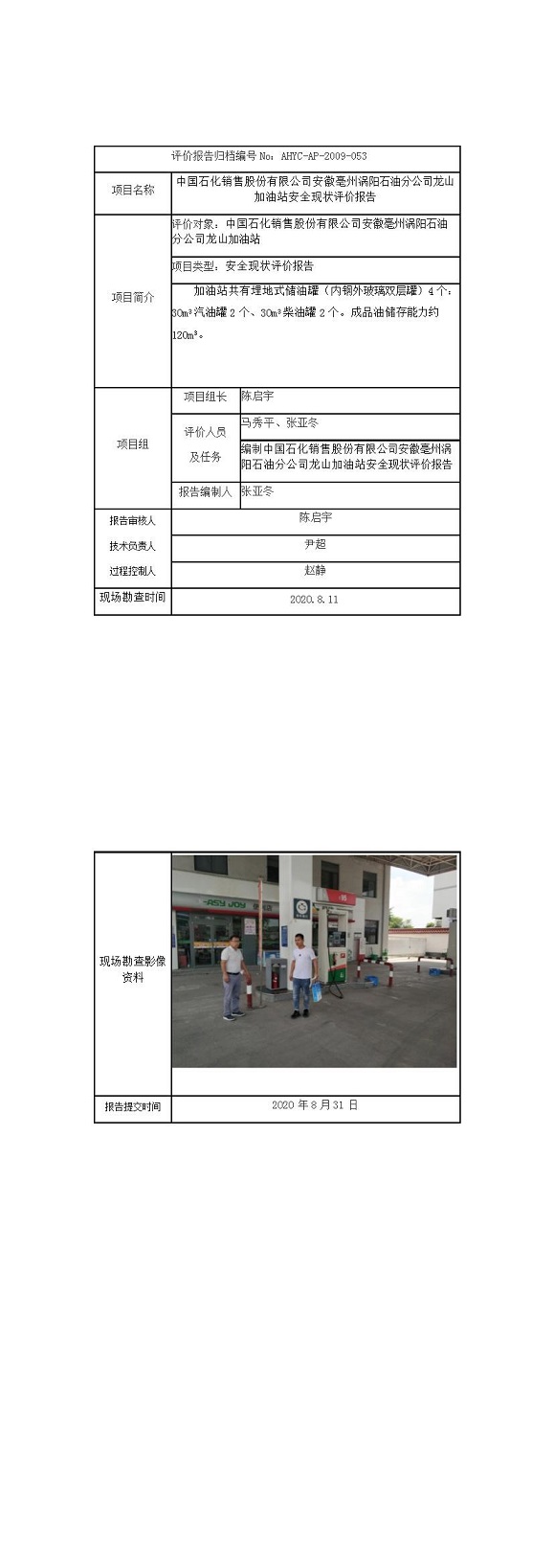 中國石化銷售股份有限公司安徽亳州渦陽石油分公司龍山加油站安全現狀評價報告