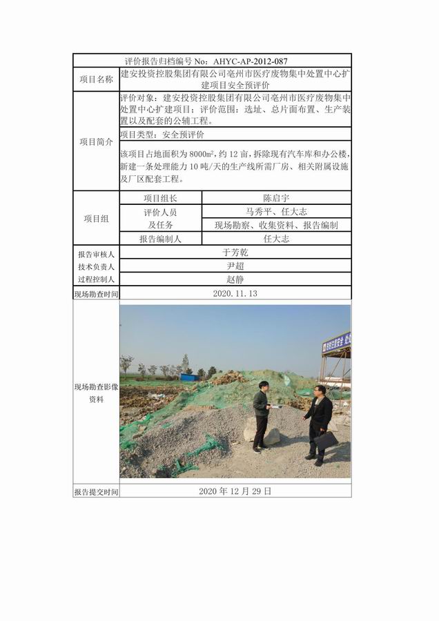 建安投資控股集團有限公司亳州市醫療廢物集中處置中心擴建項目安全預評價