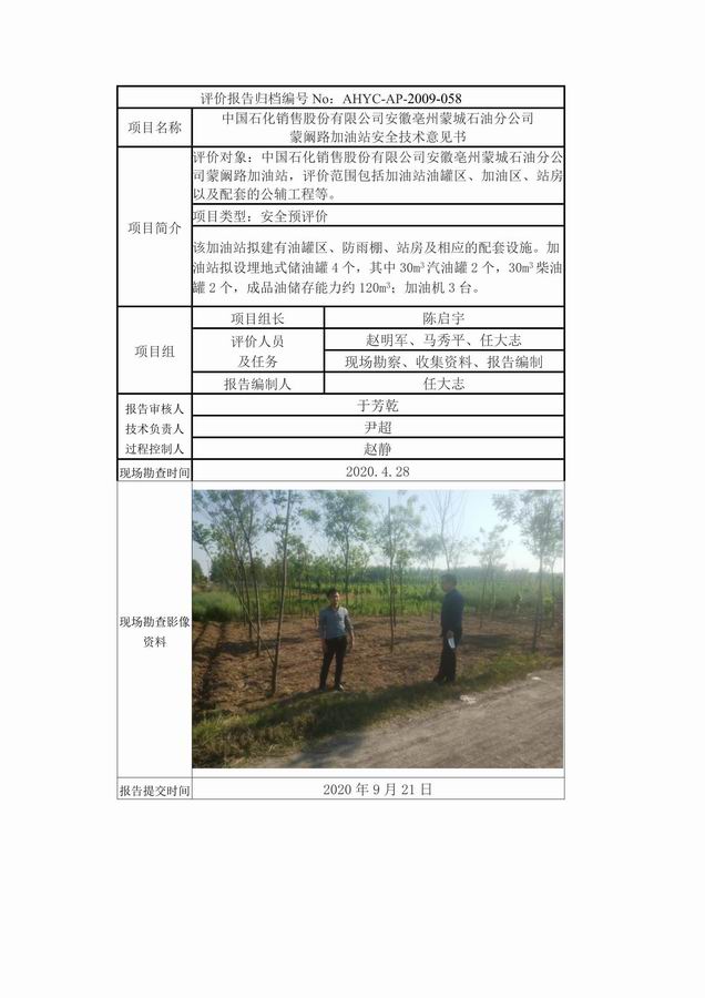 中國石化銷售股份有限公司安徽亳州蒙城石油分公司 蒙闞路加油站安全技術意見書