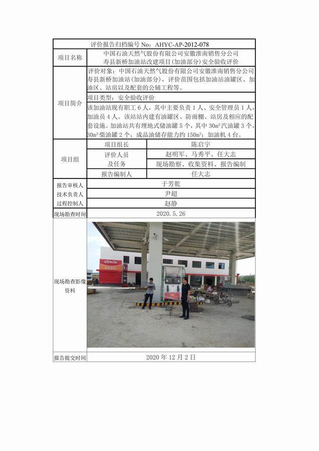 中國石油天然氣股份有限公司安徽淮南銷售分公司 壽縣新橋加油站改建項目(加油部分)安全驗收評價