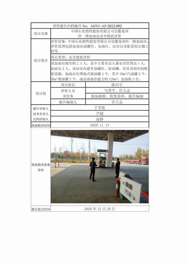 中國石化銷售股份有限公司安徽亳州 經一路加油站安全現狀評價