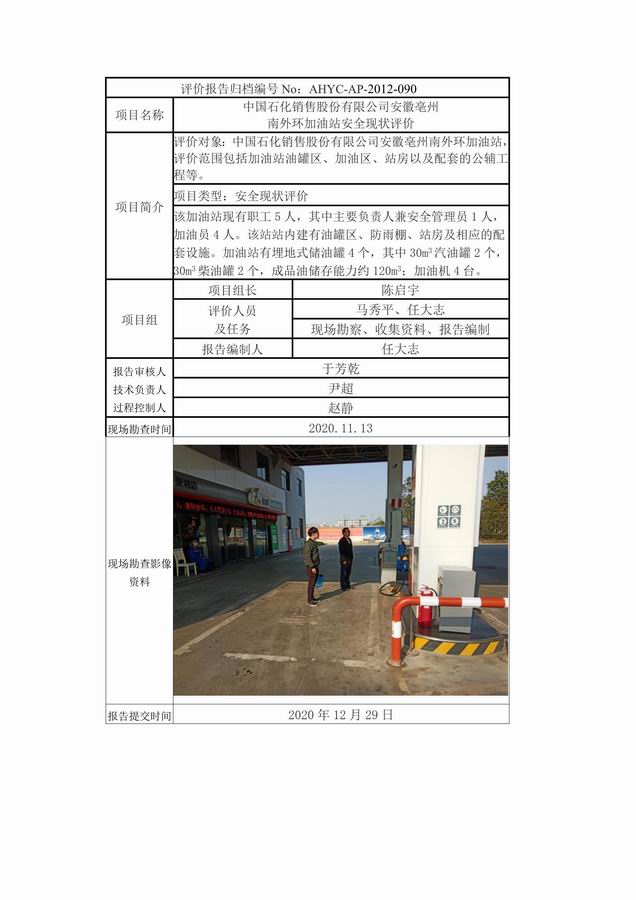 中國石化銷售股份有限公司安徽亳州 南外環加油站安全現狀評價