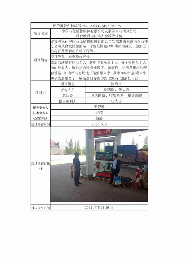 中國石化銷售股份有限公司安徽淮南石油分公司 鳳臺城西加油站安全驗收評價
