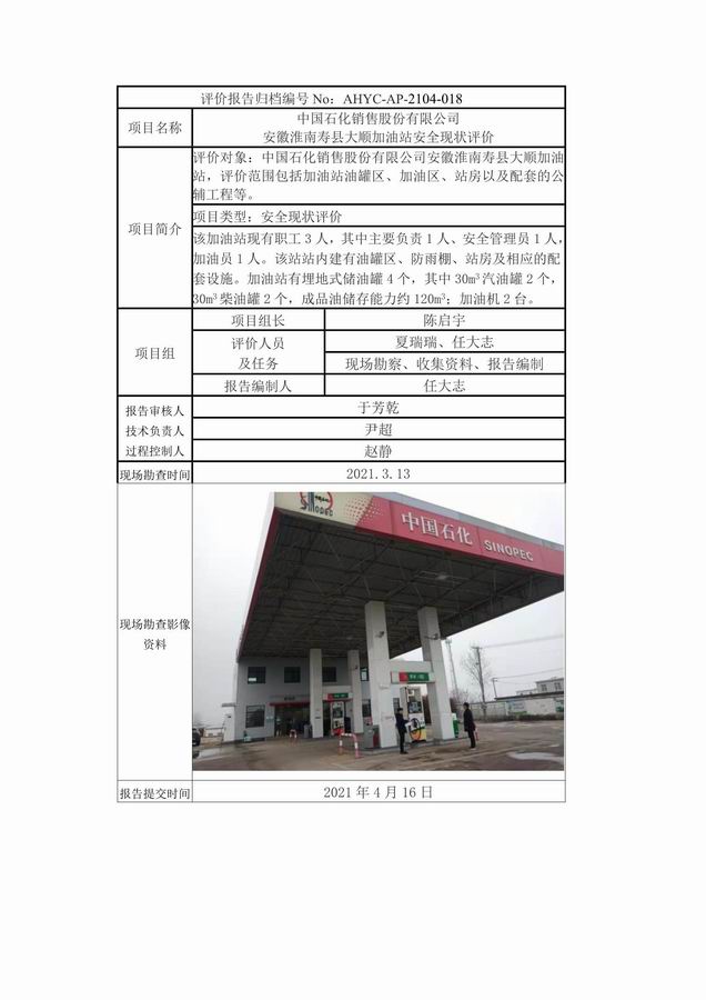 中國石化銷售股份有限公司 安徽淮南壽縣大順加油站安全現狀評價