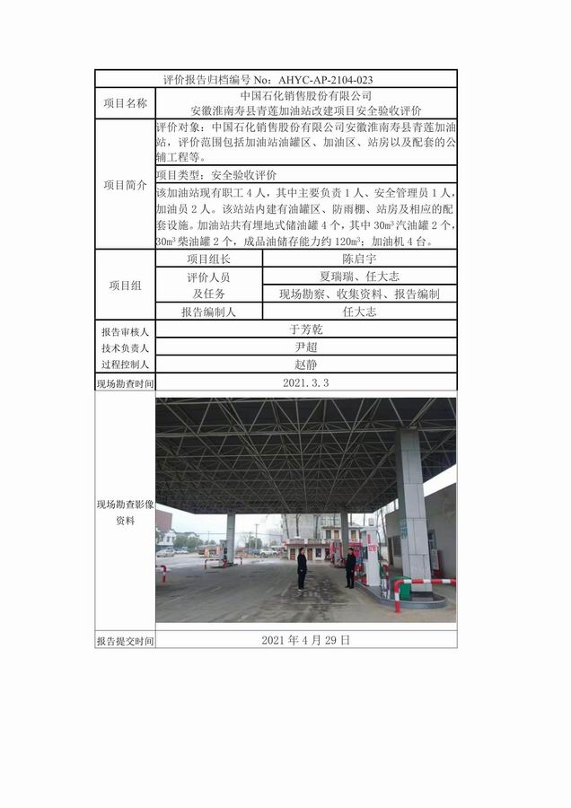 中國(guó)石化銷(xiāo)售股份有限公司 安徽淮南壽縣青蓮加油站改建項(xiàng)目安全驗(yàn)收評(píng)價(jià)