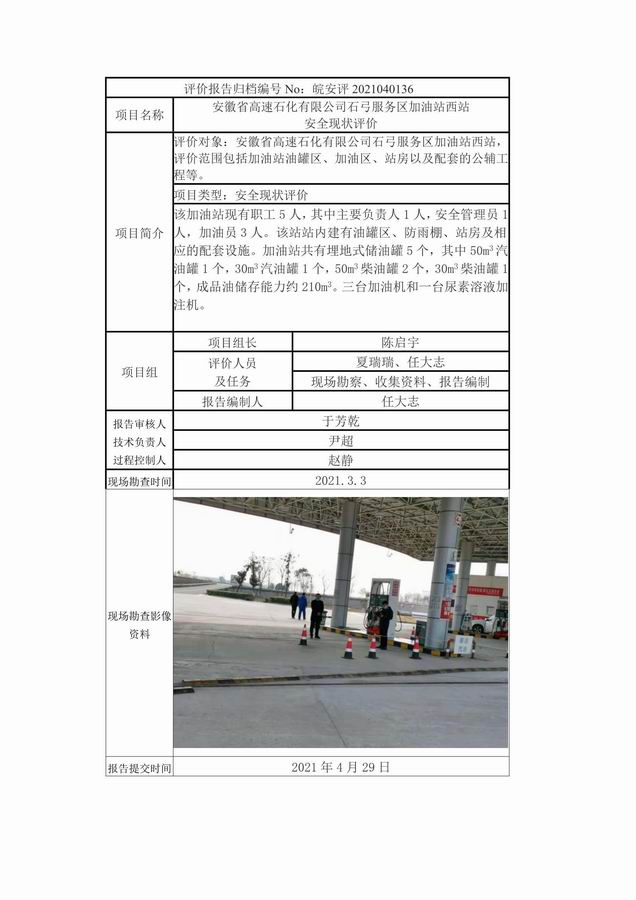 安徽省高速石化有限公司石弓服務區加油站西站 安全現狀評價
