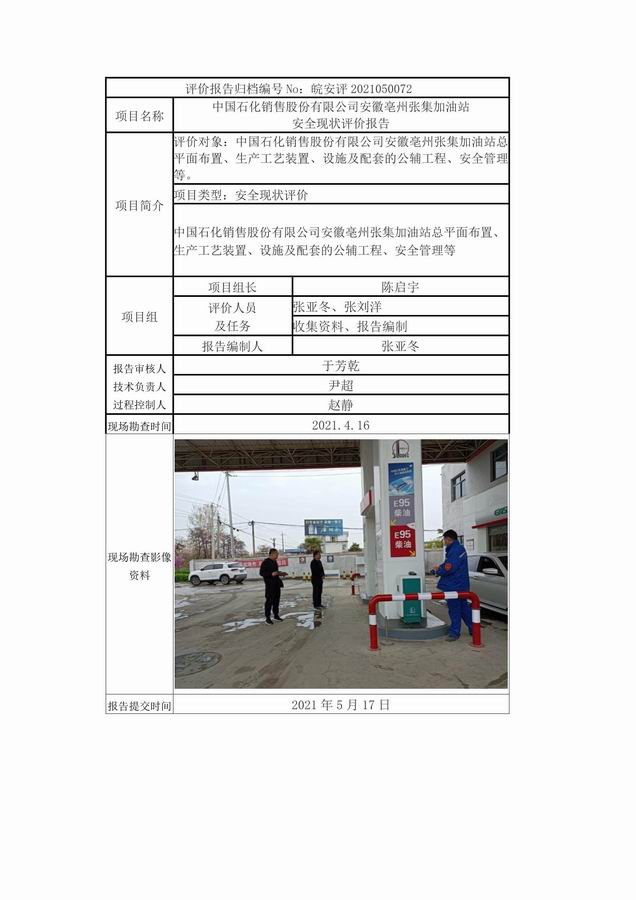 中國石化銷售股份有限公司安徽亳州張集加油站 安全現狀評價報告