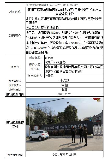 宿州市皖神面制品有限公司8萬噸/年變性燃料乙醇項目 安全驗收評價