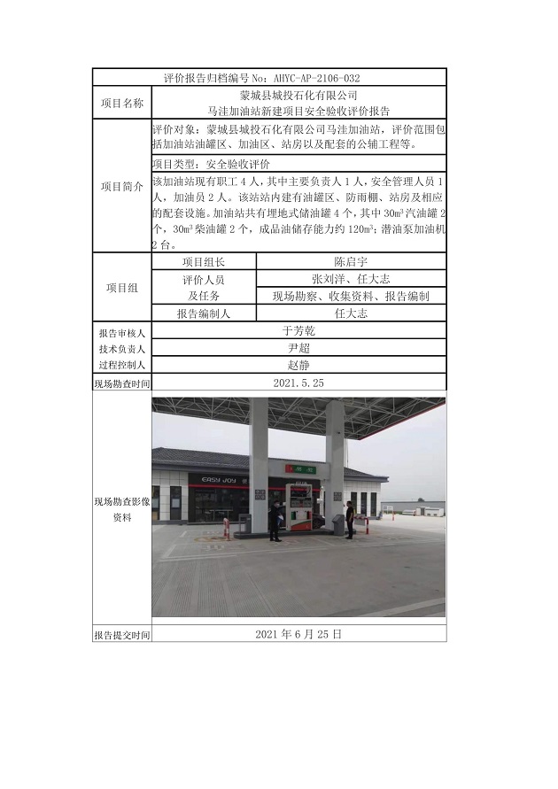蒙城縣城投石化有限公司 馬洼加油站新建項目安全驗收評價