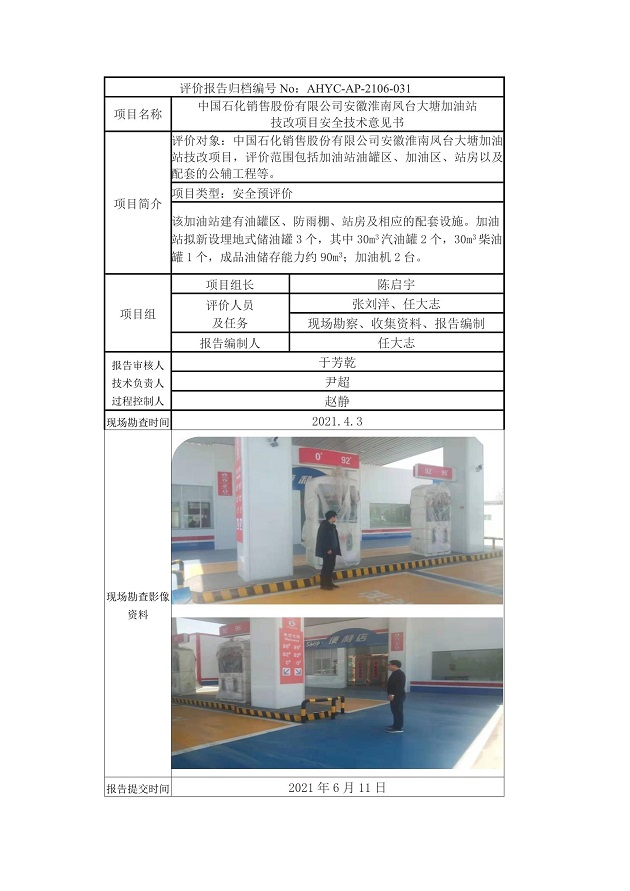 中國石化銷售股份有限公司安徽淮南鳳臺大塘加油站 技改項目安全技術意見書