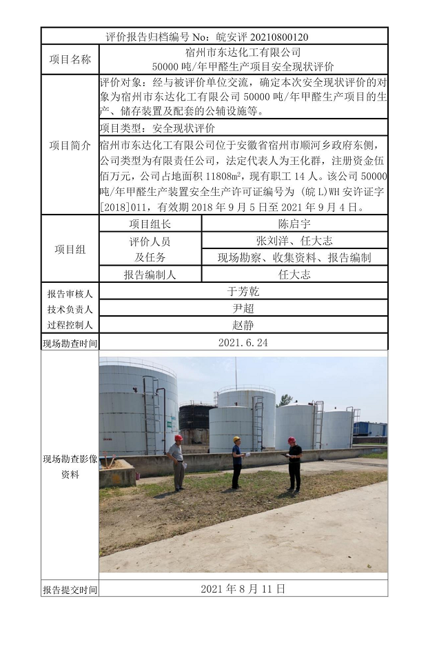 宿州市東達化工有限公司 50000噸/年甲醛生產項目安全現狀評價