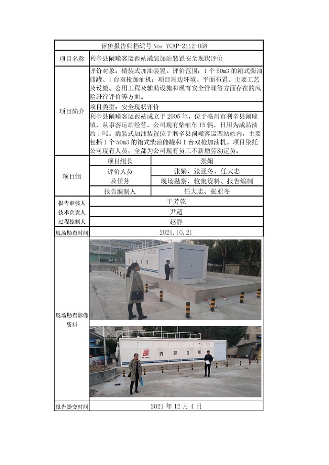 利辛縣闞疃客運西站撬裝加油裝置安全現(xiàn)狀評價