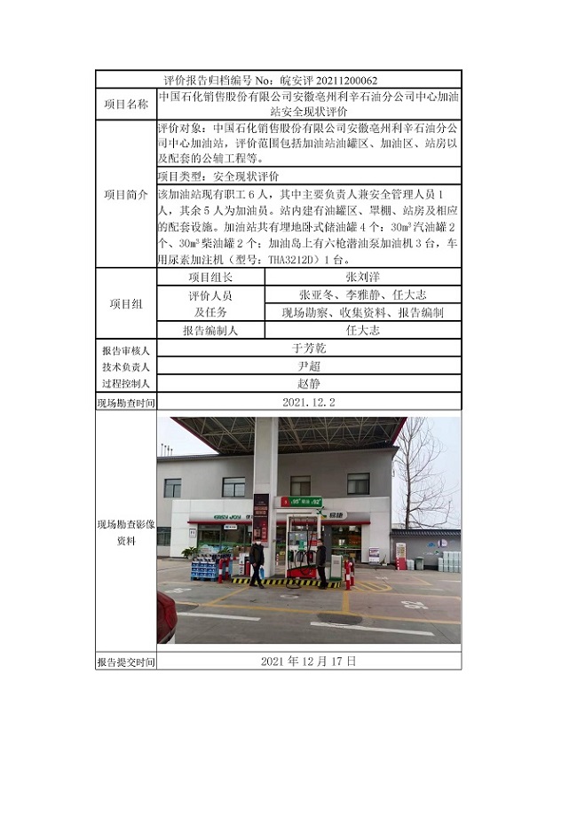 中國石化銷售股份有限公司安徽亳州利辛石油分公司中心加油站安全現狀評價