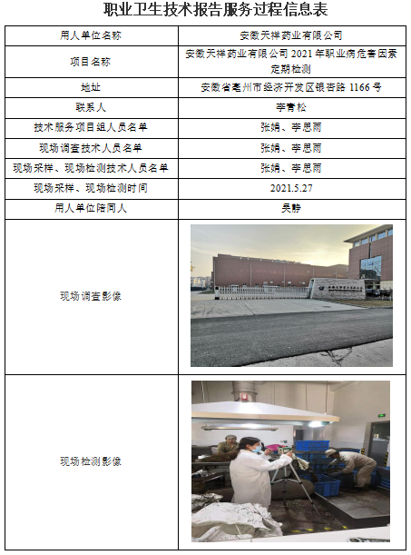 安徽天祥藥業(yè)有限公司2021年職業(yè)病危害因素定期檢測