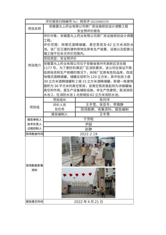安徽雷允上藥業有限公司原廠房設施規劃設計調整工程安全預評價報告