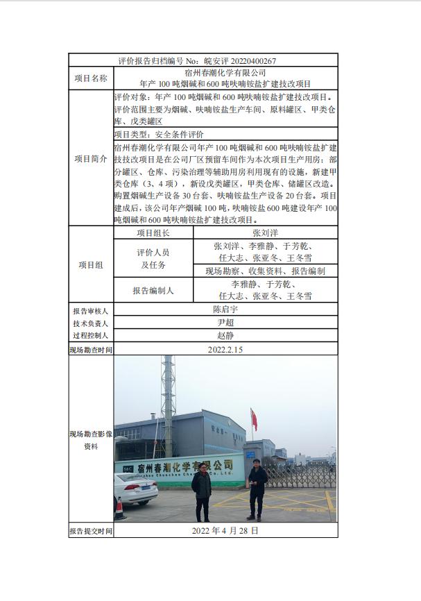 宿州春潮化學有限公司 年產100噸煙堿和600噸呋喃銨鹽擴建技術改造項目安全條件評價報告