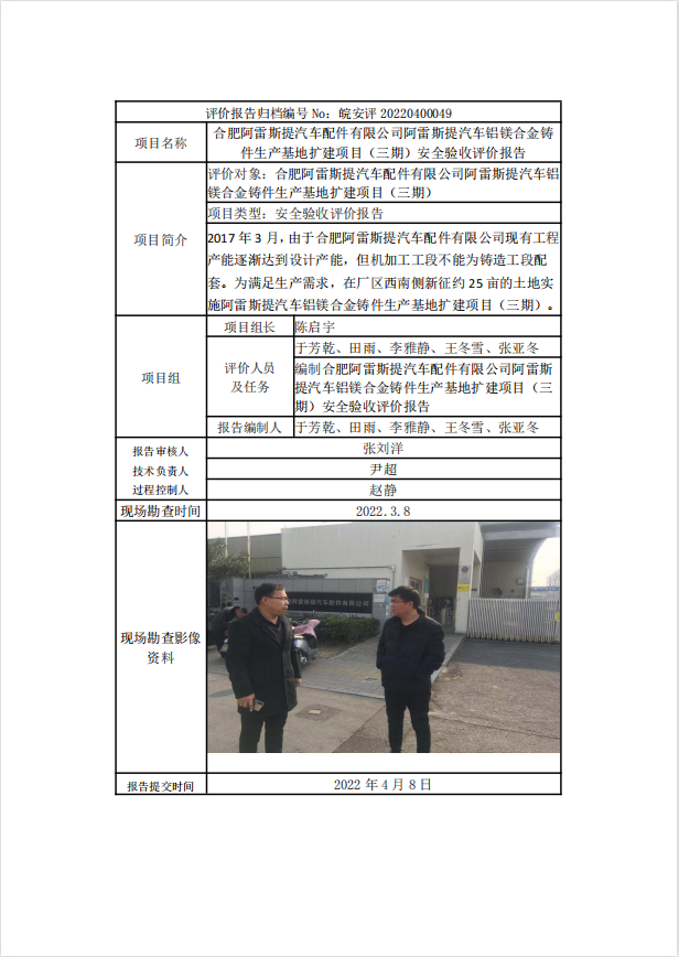 合肥阿雷斯提汽車配件有限公司阿雷斯提汽車鋁鎂合金鑄件生產(chǎn)基地擴(kuò)建項(xiàng)目(三期)安全驗(yàn)收評價報告