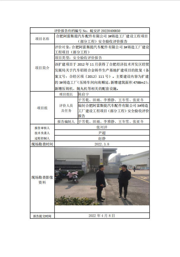 合肥阿雷斯提汽車配件有限公司3#鑄造工廠建設工程項目(部分工程)安全驗收評價報告