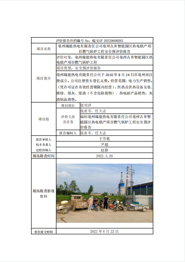 亳州瑞能熱電有限責任公司亳州古井智能園區熱電聯產項目燃氣鍋爐工程安全預評價報告