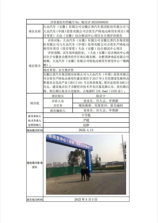大眾汽車(安徽)有限公司安徽江淮汽車集團股份有限公司與 大眾汽車(中國)投資有限公司合資生產純電動乘用車項目(項 目變更)大眾(安徽)綜合測試中心項目安全預評價報告