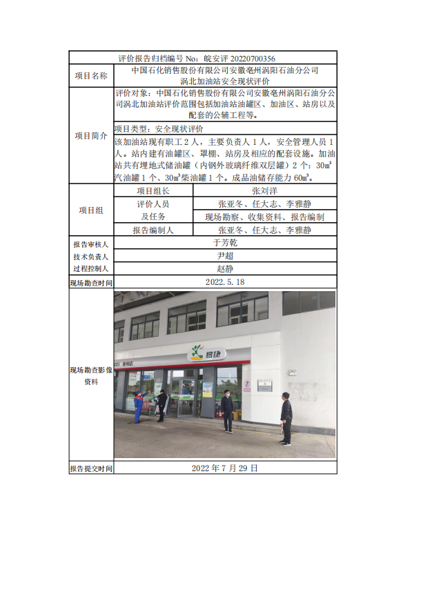 中國石化銷售股份有限公司安徽亳州渦陽石油分公司 渦北加油站安全現狀評價
