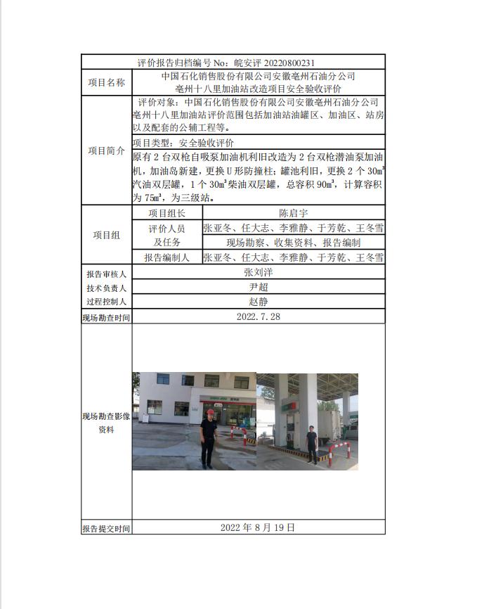 中國石化銷售股份有限公司安徽亳州石油分公司 亳州十八里加油站改造項目安全驗收評價