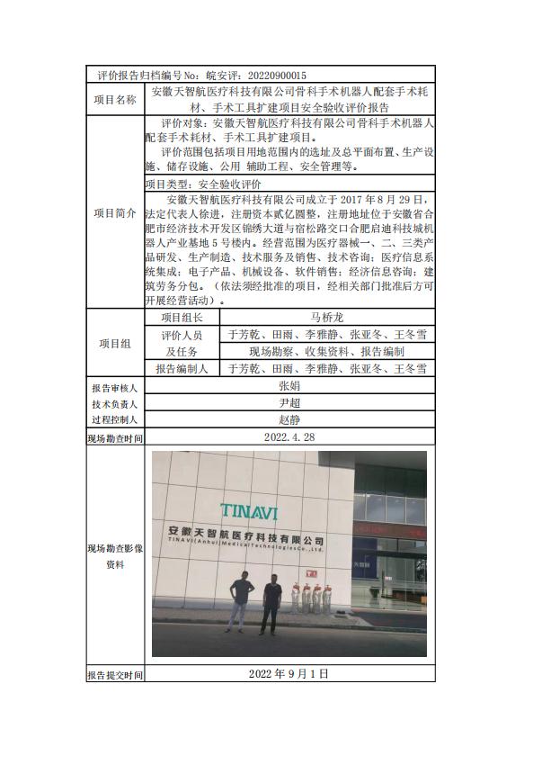 安徽天智航醫療科技有限公司骨科手術機器人配套手術耗材、手術工具擴建項目安全驗收評價報告