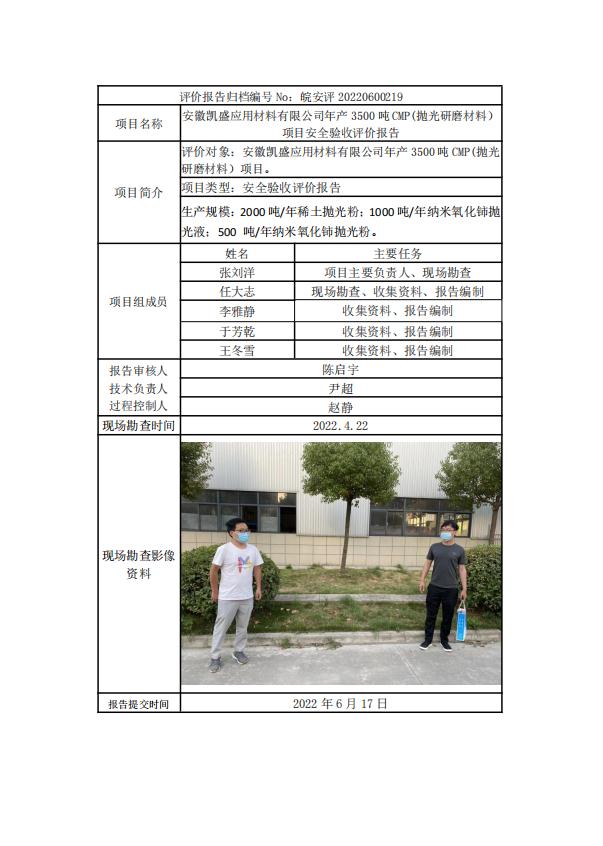 安徽凱盛應(yīng)用材料有限公司年產(chǎn)3500噸CMP(拋光研磨材料)項目安全驗收評價報告