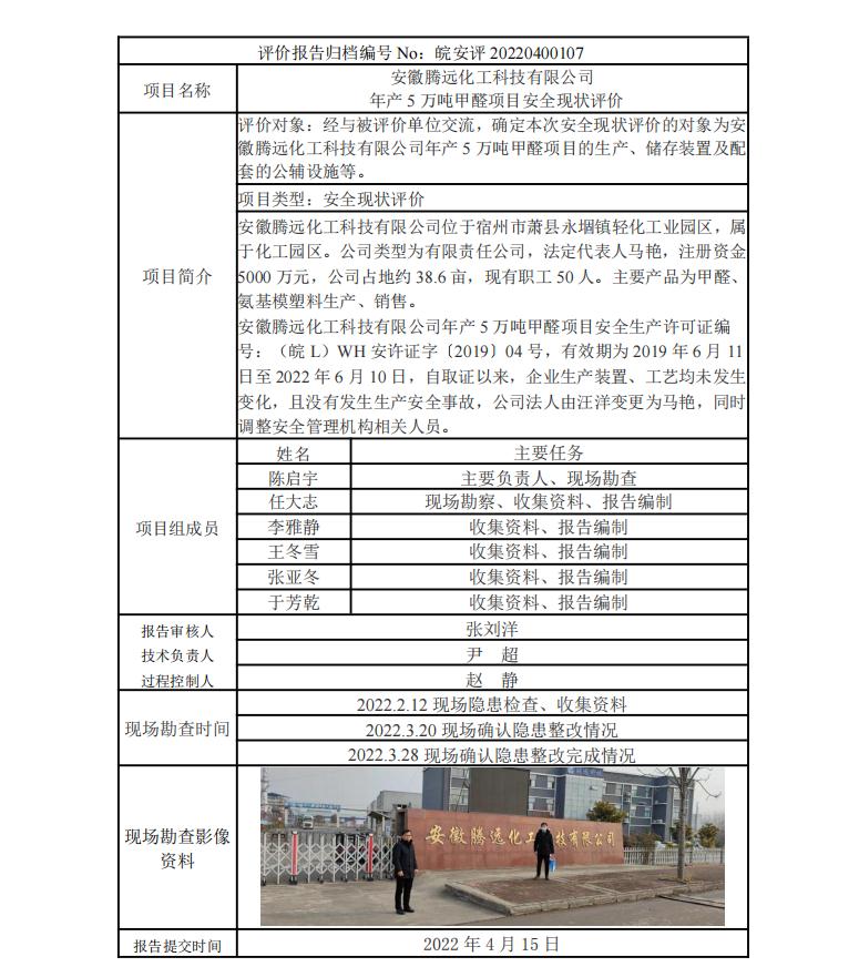 安徽騰遠化工科技有限公司 年產5萬噸甲醛項目安全現狀評價