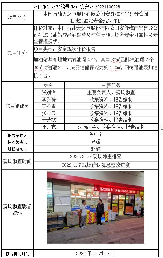 中國石油天然氣股份有限公司安徽淮南銷售分公司 匯城加油站安全現(xiàn)狀評價