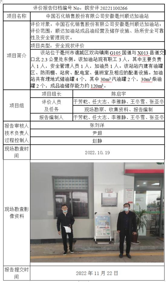 中國石化銷售股份有限公司安徽亳州順達加油站安全現狀評價