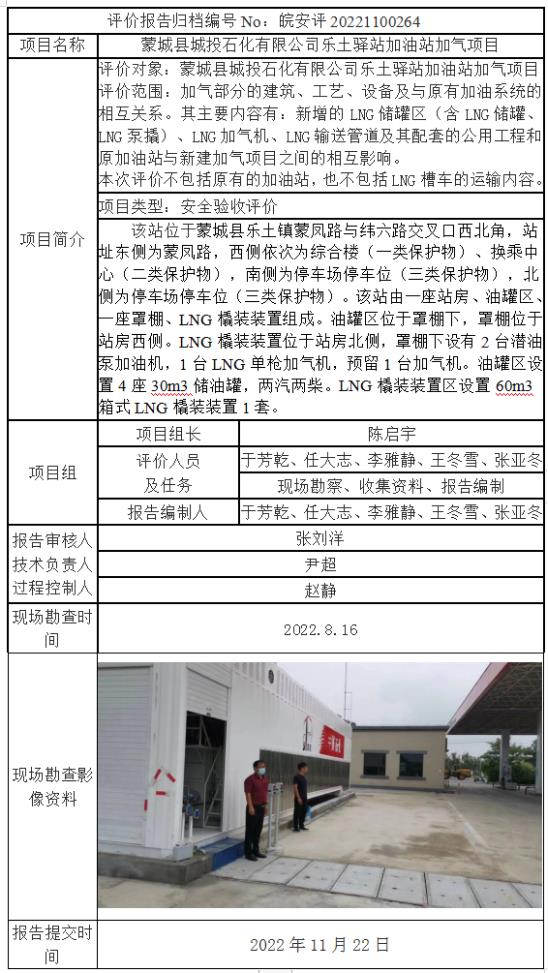 蒙城縣城投石化有限公司樂土驛站加油站加氣項目安全驗收評價