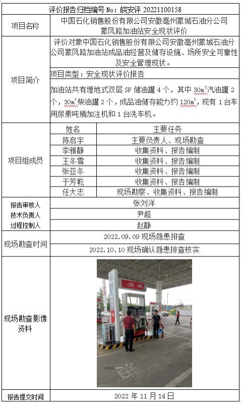 中國石化銷售股份有限公司安徽亳州蒙城石油分公司 蒙鳳路加油站安全現狀評價