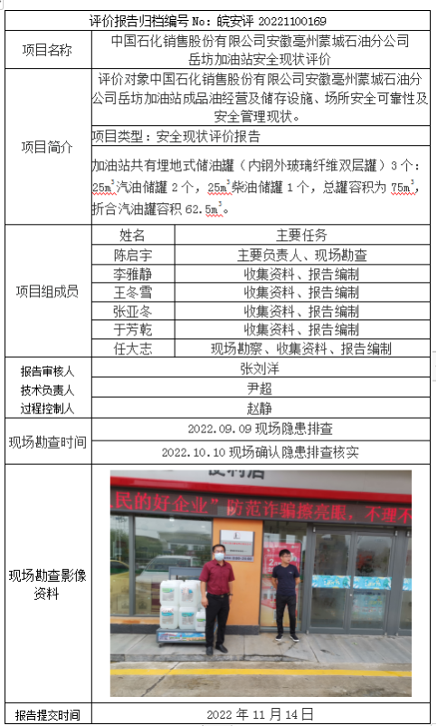 中國(guó)石化銷售股份有限公司安徽亳州蒙城石油分公司 岳坊加油站安全現(xiàn)狀評(píng)價(jià)