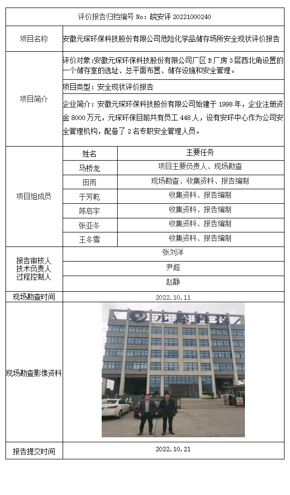安徽元琛環保科技股份有限公司危險化學品儲存場所 安全現狀評價報告