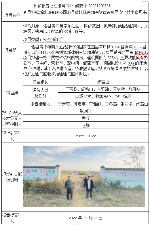泗縣標楷新能源有限公司泗縣黃圩鎮南加油站建設項目安全技術意見書