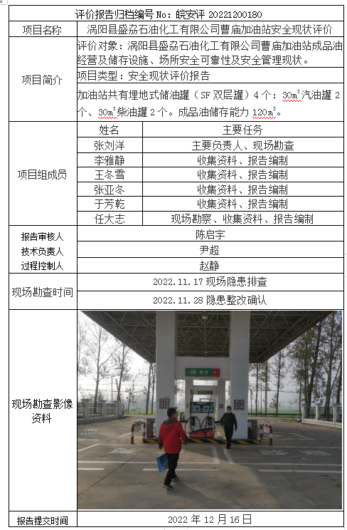 渦陽縣盛劦石油化工有限公司曹廟加油站安全現(xiàn)狀評(píng)價(jià)
