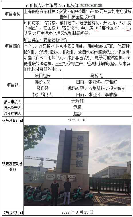 上海保隆汽車科技(安徽)有限公司年產(chǎn)50萬只智能電控減振器項目安全驗收評價