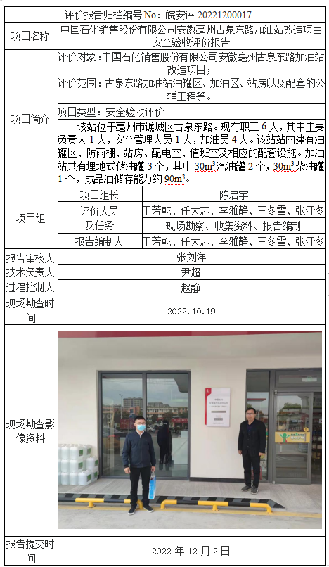 中國石化銷售股份有限公司安徽亳州古泉東路加油站改造項目安全驗收評價報告