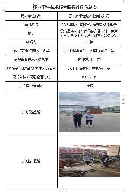 蒙城縣佰世達木業有限公司2023年職業病危害因素定期檢測報告
