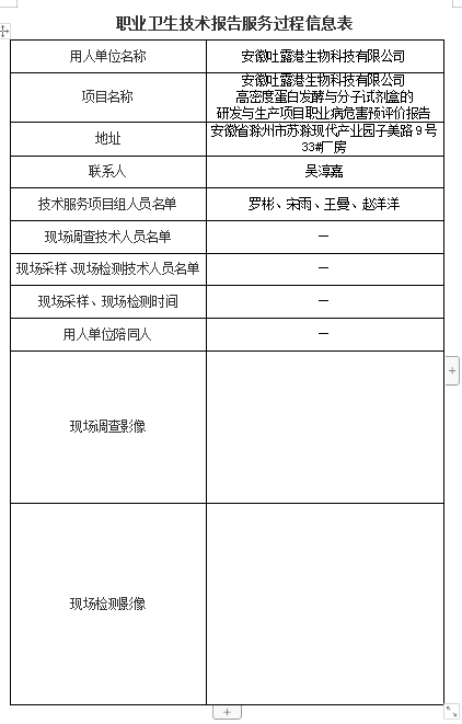 安徽吐露港生物科技有限公司 高密度蛋白發酵與分子試劑盒的 研發與生產項目職業病危害預評價報告