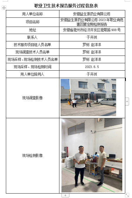 安徽益生源藥業有限公司2023年職業病危害因素定期檢測報告