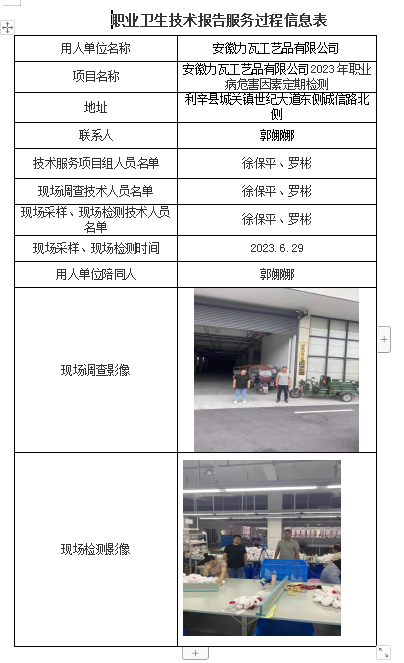 安徽力瓦工藝品有限公司2023年職業(yè)病危害因素定期檢測