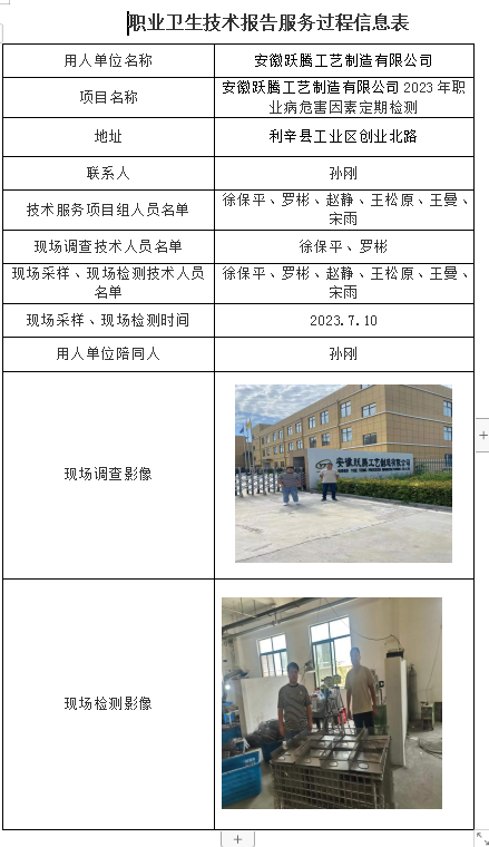 安徽躍騰工藝制造有限公司2023年職業病危害因素定期檢測
