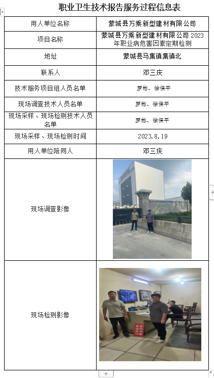 蒙城縣萬乘新型建材有限公司2023年職業(yè)病危害因素定期檢測(cè)