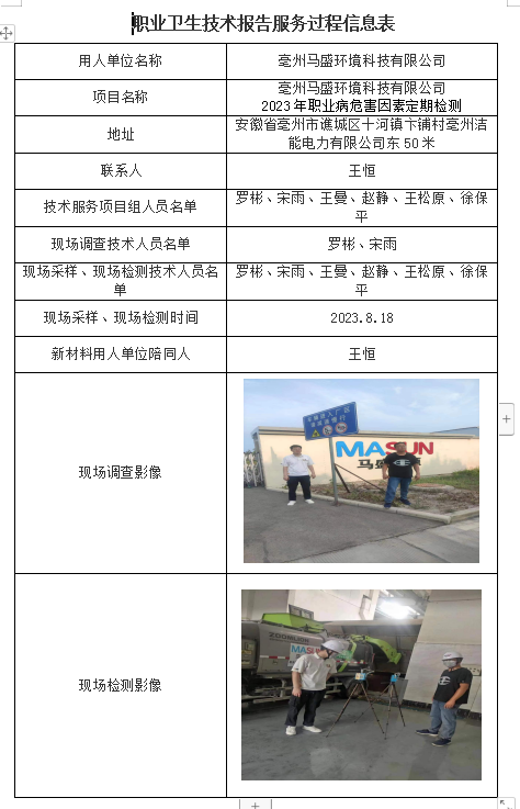 亳州馬盛環境科技有限公司 2023年職業病危害因素定期檢測