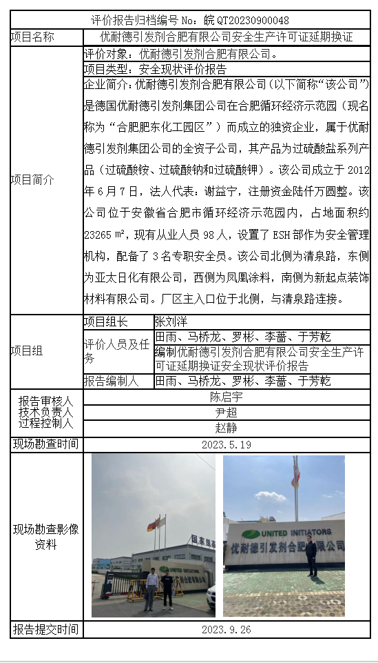 優(yōu)耐德引發(fā)劑合肥有限公司安全生產(chǎn)許可證延期換證