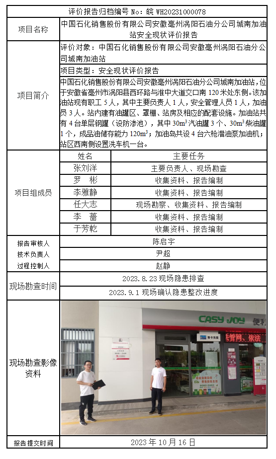 中國石化銷售股份有限公司安徽亳州渦陽石油分公司城南加油站安全現(xiàn)狀評(píng)價(jià)報(bào)告