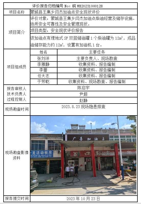 蒙城縣王集鄉(xiāng)閆杰加油點(diǎn)安全現(xiàn)狀評(píng)價(jià)